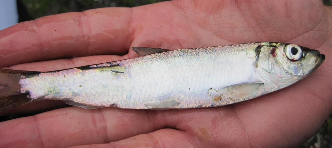 - Pacific herring (Clupea harengus pallasi) — Grows up to 9 inches long. Bluish green to olive dorsal with silvery sides. No adipose fin. Large scales on body; none on the head and tail. The largest stock is in the Cherry Point area (northern Puget Sound).