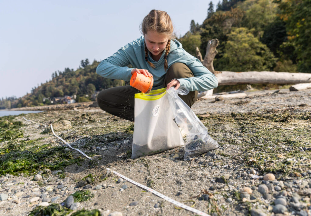 Forage fish spawning surveys use Washington Department of Fish and Wildlife’s (WDFW) protocols and focus on two species, surf smelt and Pacific sand lance, which lay eggs on intertidal sand-gravel beaches in the nearshore environment. In order to sample for the presence or absence of eggs, sediment samples are taken along a 100 foot pre-defined transect location. Volunteers collect sand from the top 1-2 inches of the beach, where eggs would be deposited. In total, about 1.5-2 liters of sand is collected along the transect. Click here to see the full protocol and sample directions explanation.